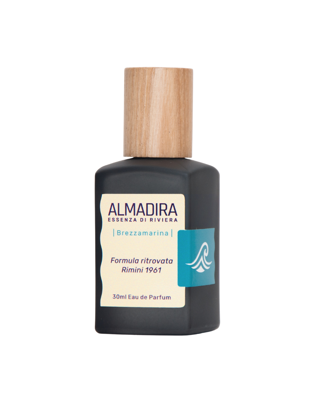 Accanto, alcune boccette da 30 ml in vetro scuro. Essenziali. Da portare come si porta un ricordo. Il flacone è nero anche oggi, come l’abbiamo trovato. L’abbiamo solo modernizzato, alleggerito nelle linee. Ma siamo rimasti fedeli a ciò che abbiamo visto. Abbiamo aggiunto un tappo in legno per ricordare l’almadira che lascia il mare. Oggi, Almadira vive solo in formato 30 ml. Come fosse ancora nascosta in quella valigia.